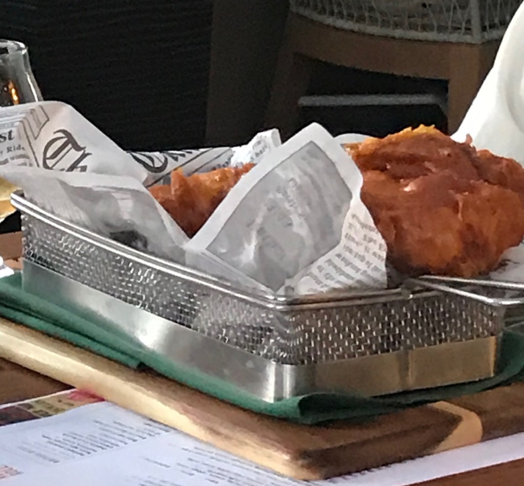 Large plates and share items include Collins’ enormous fried fish and chips. A huge piece of local rockfish is drenched in beer batter and fried golden brown and crispy. It rests on top of thick hand cut chips (fries) and is served with a container of house-made tartar sauce and ketchup.