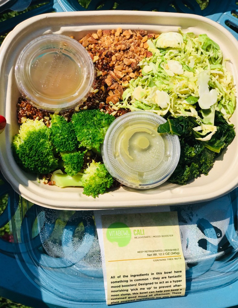Their Cali Bowl is full of plant powered, healthy ingredients that improve your mood. It’s made with RightRice, quinoa, shaved Brussel sprouts, broccoli, kale, avocado crema, and a container of Kombucha apple cider vinaigrette to drizzle on top. It was very clean tasting, healthy and filling.
