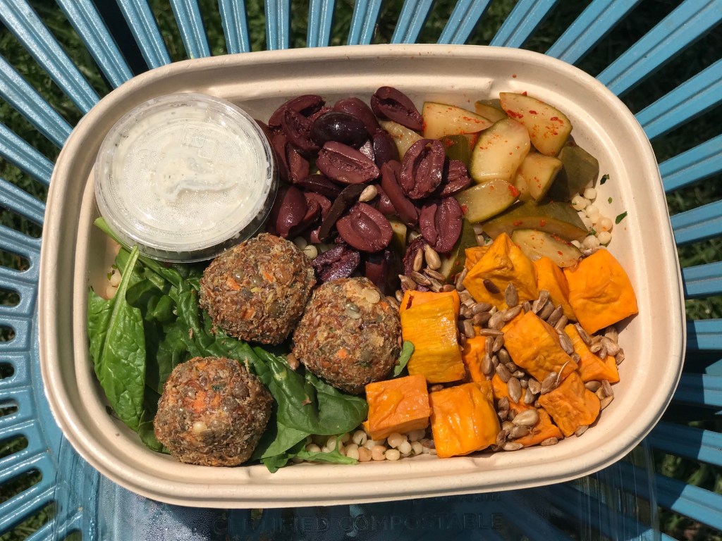 The Mediterranean is ideal for gut health. The sprouted lentil and flax seed falafels contain more protein than a typical falafel. Plus it is less salty than a typical one, and these falafels offer more folate, iron, potassium, zinc. The chefs low-temperature cooking methods ensure that the nutrients and enzymes stayed intact. This bowl supports gut and immune health with Israeli Pearl cous cous, sprouted lentil and flax seed falafel, sweet potato, and a delicious plant-based tzatziki. I ate half from the bowl and put the other half in a lavash wrap for dinner.