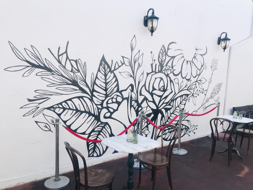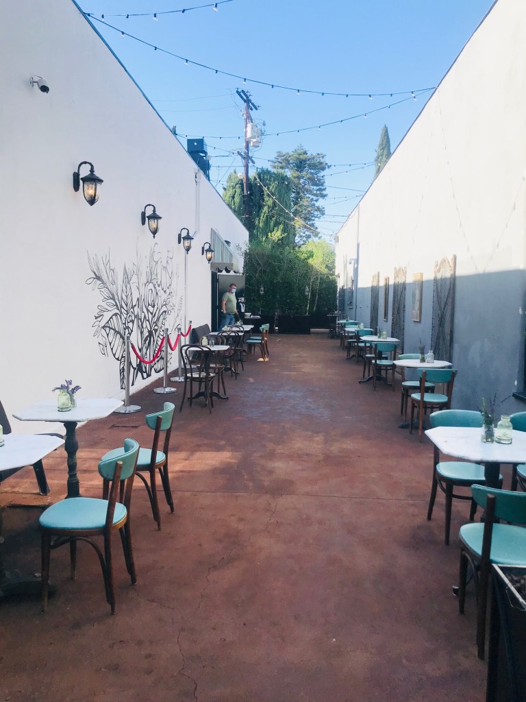 They creatively designed an al fresco dining area on the newly refurbished semi-covered patio, plus added a new outdoor seating area that expands into an easement facing Santa Monica Boulevard. There is an eye-catching black and white mural painted on one wall, a vine-lined trellis and festive bistro lights hanging above to illuminate the area in the evening.