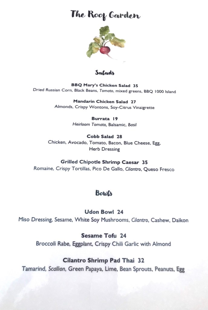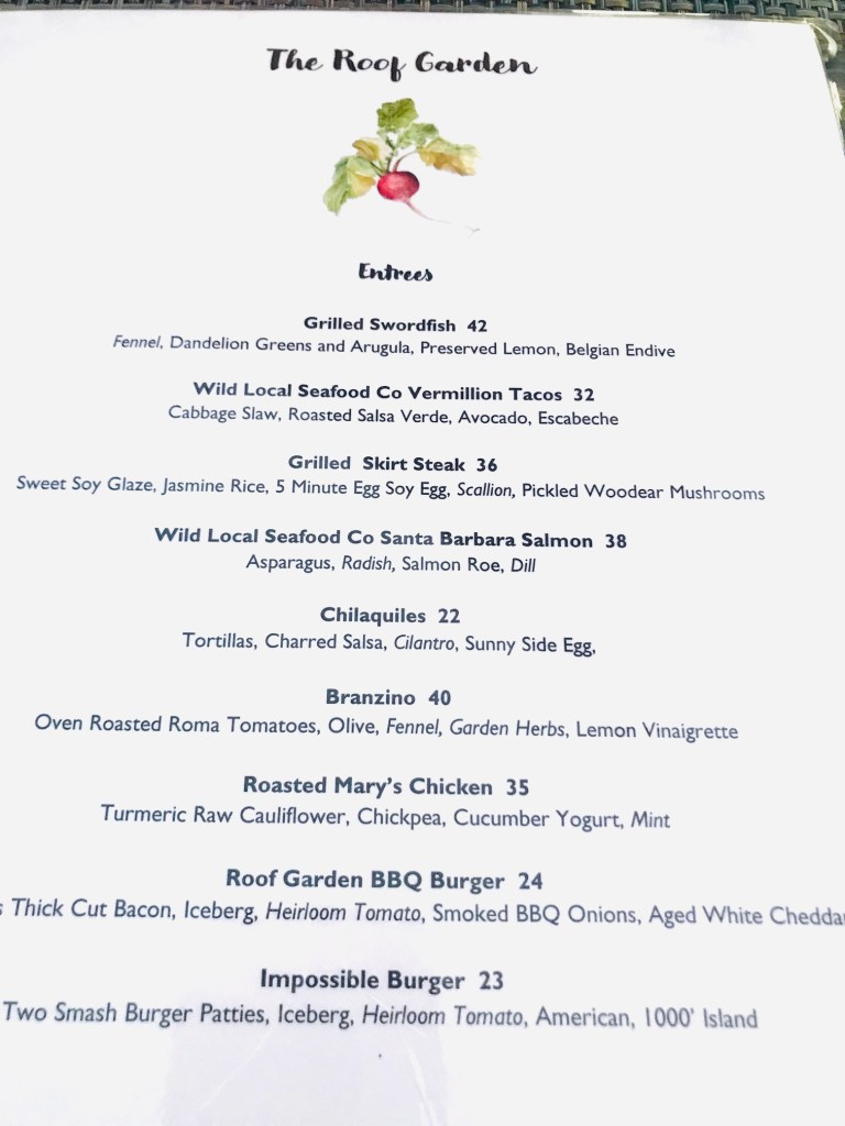 He also has created a seasonal menu at The Roof Garden, near his secret garden. My husband and I were eager to try his freshly picked garden to plate offerings.