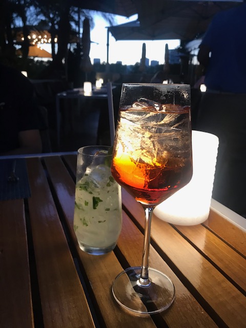 Riding the elevator up to the Chef David’s The Roof Garden, we stepped out onto a beautiful al fresco setting with yellow and white striped umbrellas, a teak bar, tables set for two to four guests, and a socially distanced lounge area with chairs arranged around a flickering fire pit. As the sun set, the lights of Beverly Hills and Century City high rise buildings illuminated the sky.