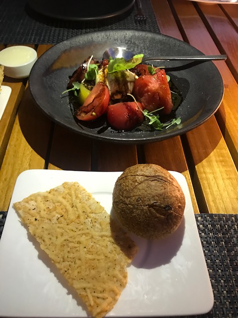 Waiting for our table to be throughly sanitized, we walked out to the end of the pool area to take a peek at the secret garden. Looking down we noticed rows of vibrant and colorful tomatoes, herbs standing tall and stalks of fennel.