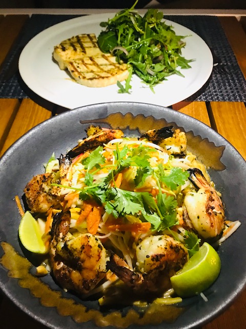 My favorite was the cilantro shrimp pad Thai that had a tamarind glaze. There were five large grilled shrimp, and sliced scallions, crunchy green papaya, crisp bean sprouts, diced peanuts and egg on top. Wedges of lime can be squeezed on top to offer a refreshing touch of citrus with each bite.