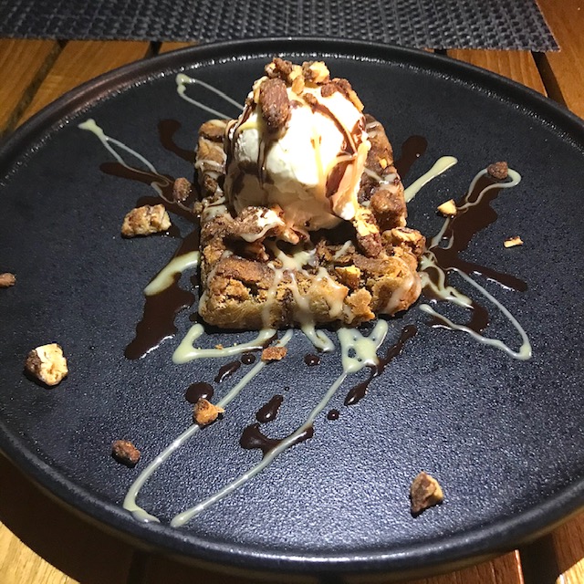 Be sure to save room for dessert, the whole wheat butterscotch blondie enhanced with ribbons of dulce de leche, chocolate sauce and a scoop of horchata ice cream with oven roasted, cinnamon sugar covered nuts on top.