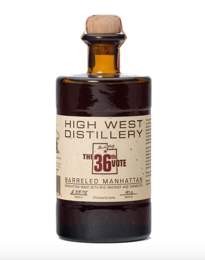 High West Distillery created ‘The 36th Vote Barreled Manhattan’ to commemorate Utah’s role in the repeal of Prohibition. This cocktail is aged an additional 90 days, allowing the flavors to integrate in a well-balanced harmony with the rye whiskey base. This ready to drink cocktail can be enjoyed on the rocks with a slice of orange or lemon wheel for garnish.