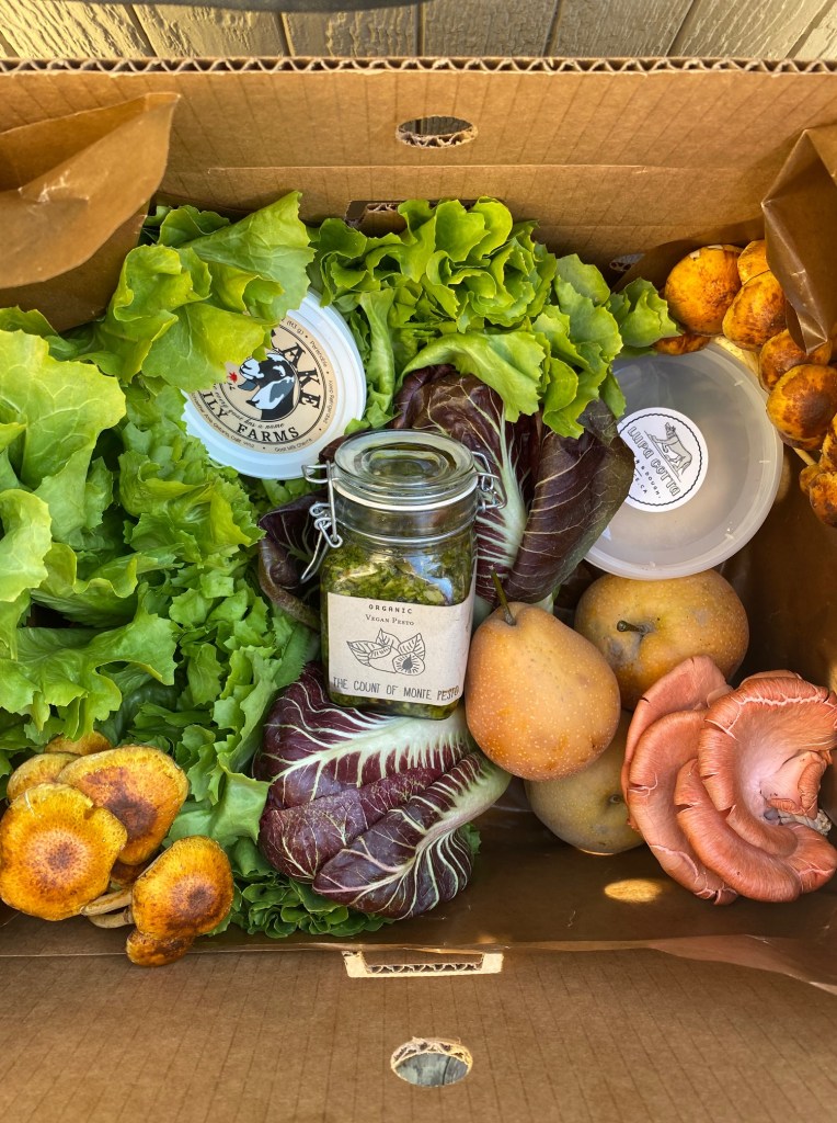 There were 5 just-picked apples, three different types of lettuces and beautiful mushrooms from Santa Barbara based Golden State Papayas farm. The farm first brought Hawaiian papaya to the West Coast 7 years ago and sold them at So Cal’s Farmers Markets. With a large greenhouse, they cultivated their own Golden State Papaya non GMO mushrooms in soil with no chemical pesticides or synthetic fertilizers. Lauren said her Yellow Mushrooms taste like cashews, and her Cinnamon Cap mushrooms offer an earthy and nutty flavor.