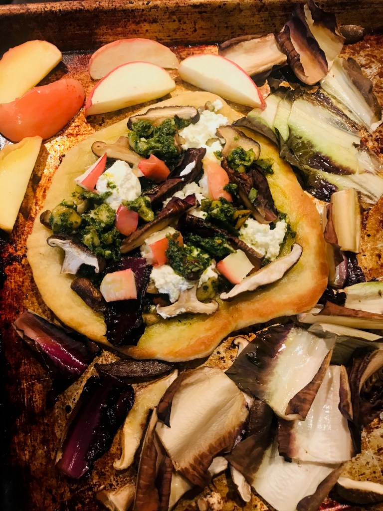 Heating the oven to 450 degrees, we placed the two dough discs on a cookie sheet with a sheen of olive oil. Next we cut up two apples and placed that on the cookie sheet, along with sliced mushrooms, and chopped radicchio and frisee.