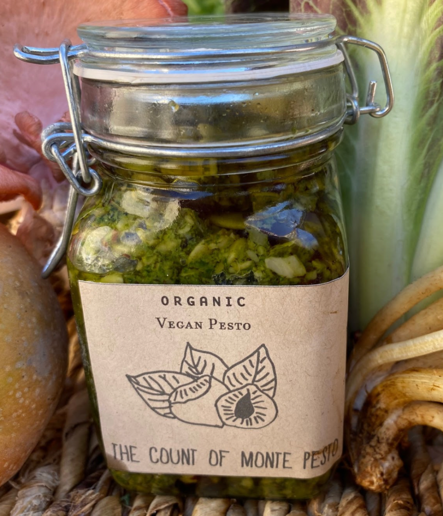 One friend is Lauren’s neighbor, Martina Buckley. Not only is she a wonderful cook, she makes the chunkiest supergreens pesto. Lauren thought this would make an ideal topping for the pizza dough, besides her mushrooms. Inside the box was an 8oz jar of raw supergreens vegan pesto from Martina Buckley’s The Count of Monte Pesto. It’s made with roasted hazelnut, basil, healthy greens, olive oil, garlic, pumpkin seeds and lemon zest on top. This also makes a fabulous salad dressing.
