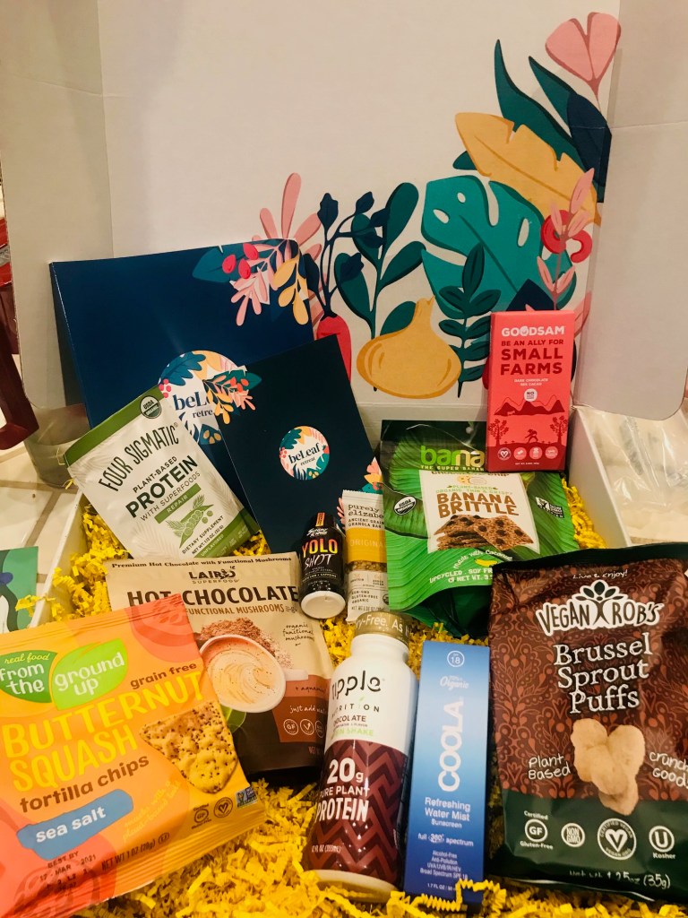 I just received my VIP beLeaf Retreat box filled with participating partners products to enhance the upcoming 2-day virtual retreat on Jan. 9 and Jan. 10, 2021. Inside the box were snacks and products with a plant-based twist. There was Ground Up chips, Laird Superfood, dairy-free Ripple, protein by Four Sigmatic, a healthy snack bar by Purely Elizabeth, facial mist with sunscreen by Coola, Thrive Market, Purple Carrot, Splendid Spoon, toasted coconut chocolate chip banana brittle by Banana gluten-free puffs by Vegan Rob’s and Good Sam small farm chocolate. Also inside the box was a custom journal filled with all the session information for the beLeaf Retreat.