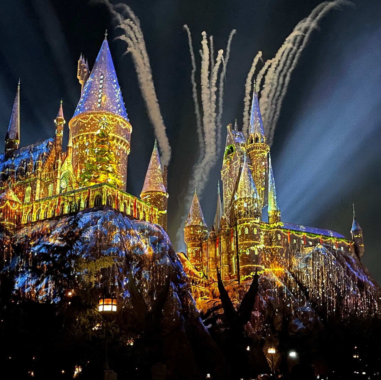 At dusk, stunning imagery and animation display are projected illuminating Hogwarts castle. The sounds of arrangement music from the Harry Potter film series fill the area.