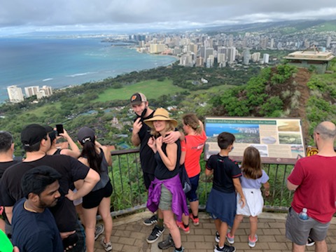 Another morning, we laced our hiking shoes to walk up to the top of the Diamond Head crater, now a national park. Named “Brow of the Tuna” by ancient Hawaiians, you can see the shape of a dorsal fin in the ridge line. Another Hawaiian name for Diamond Head is “leah”, meaning wreath of fire, reflecting the ancient practice of lighting fire on the crest of the volcano to guide canoe fleets back to the island.