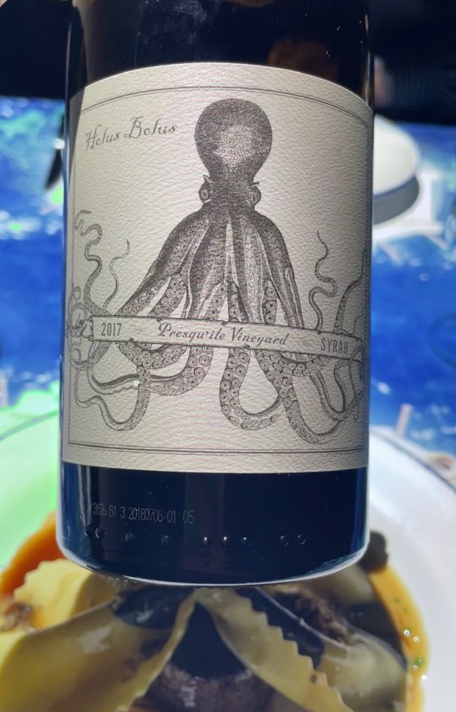 The wine steward poured a glass of Holus Bolus 2017 Presqu’ile Vineyard Syrah to enjoy with the largest farfalle bow tie pasta topped with seasonal winter black truffles, and underneath was a pan seared porcini crusted petit filet mignon in veal jus.