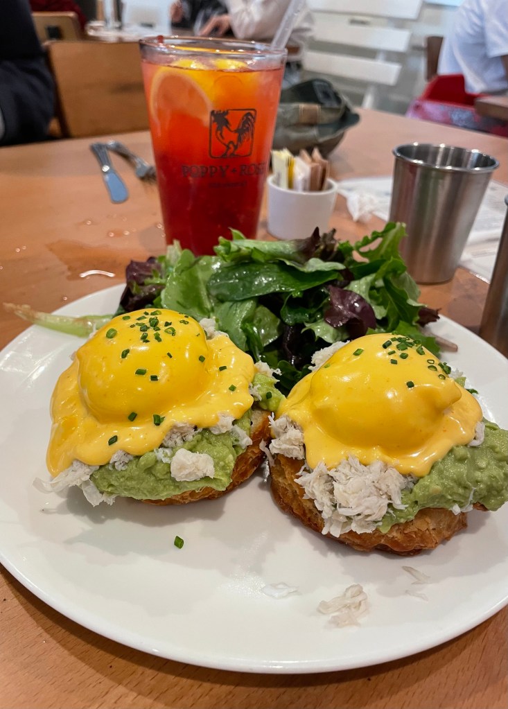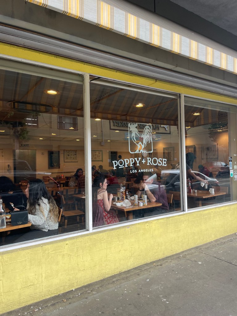 Last Sunday I enjoyed a comforting Southern style brunch at Poppy + Rose in DTLA’s Flower District. My friend Lawrence raved about this restaurant months ago, when she excitedly told me that the owners Chef Michael and Kwini Reed are going to co-host Masters of Taste at the Rose Bowl Stadium on April 2. Another friend raved about the Benedicts and mimosas at Poppy + Rose. Chef Michael grew up in Oxnard and trained at the Culinary Institute of America in New York. He cooked at The Modern, an acclaimed restaurant at the Museum of Modern Art in Manhattan while still at culinary school.