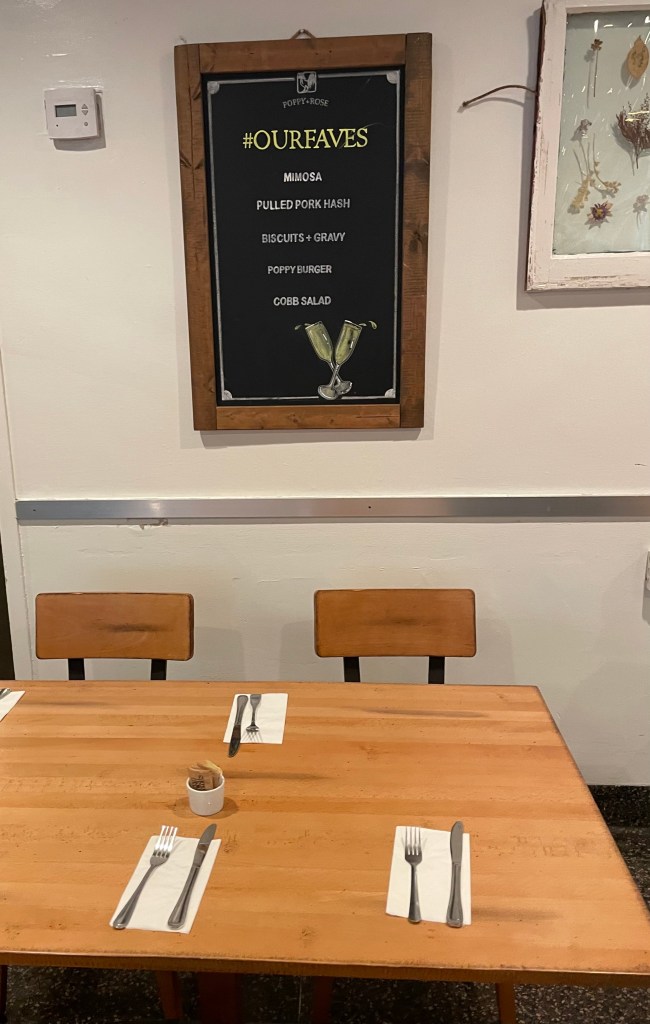 The atmosphere is cheery with tables for two next to the window adorned with the Poppy + Rose logo and a rooster. In the center are two long communal wooden tables under the eye-catching corrugated metal ceiling adding ambiance to the room.