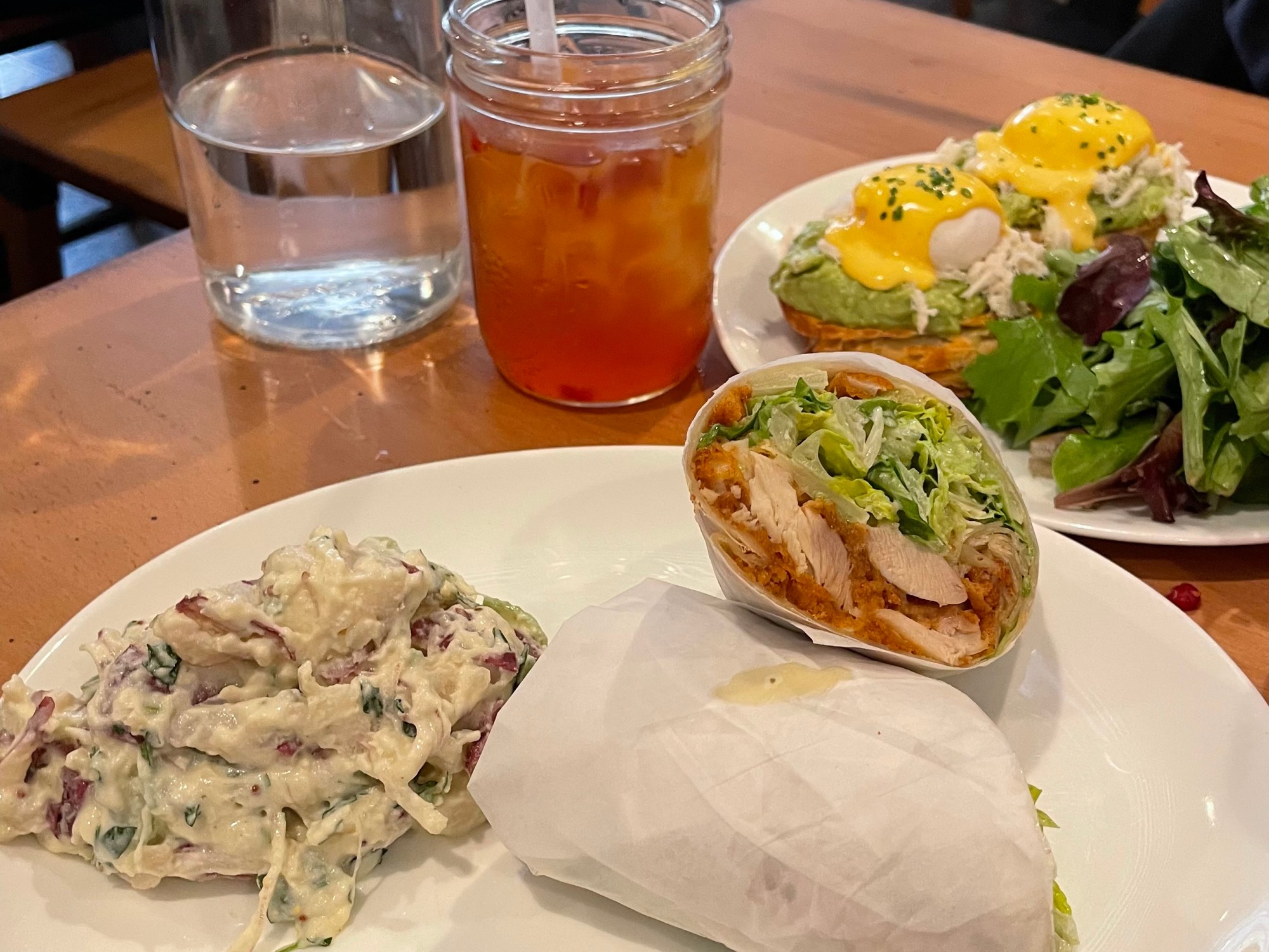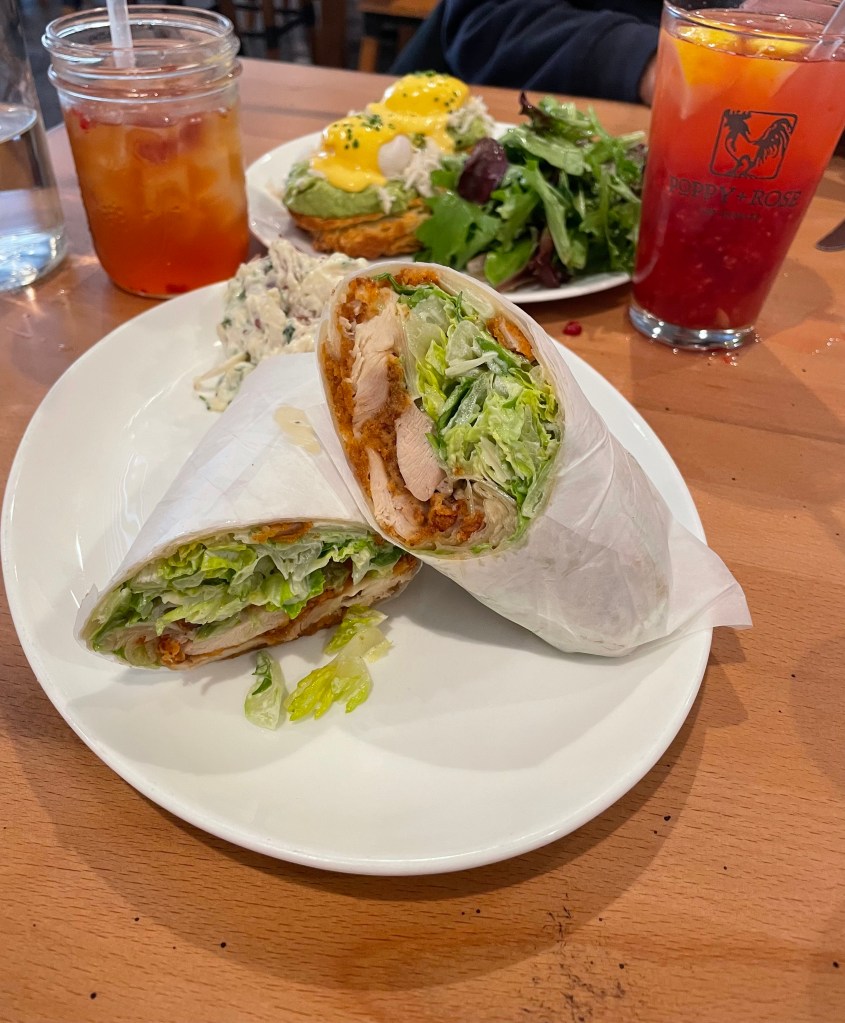 My husband ordered the Caesar salad with tender buttermilk-brined fried chicken thigh meat wrapped in a four tortilla. The handheld sandwich was served with a chunky potato salad that had a nice crunch from chopped onions and celery.