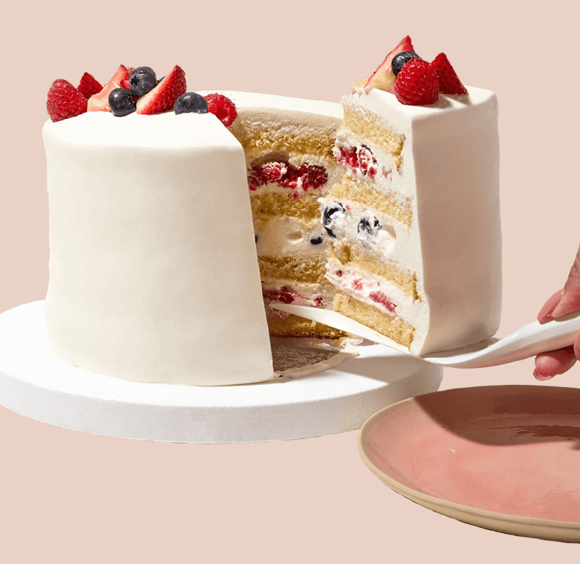 The festive Triple Berry Cake is made with soft vanilla sponge cakes and its topped with pastel colored fluffy whipped cream frosting. Fresh berries are folded in between each layer. The top is crowned with flowers.