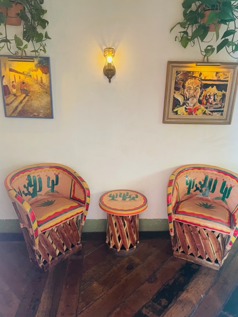 Located in a bold salmon colored building, the entrance has small alcoves with colorful votive candles resting inside. A green decorative door welcomes guests into the stunning reception area with hand painted, Mexican leather barrel chairs. Recycled wood flooring leads diners to a dramatic archway into the oval bar with high back stools. The lounge area is filled with intimate and cozy arched booths decorated with movie posters on the walls.