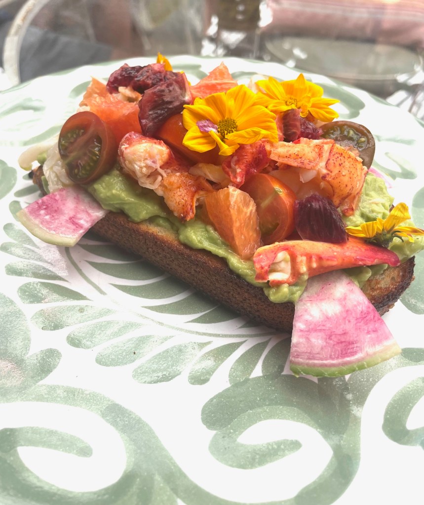 Included with this interactive platter was a stunning lobster and avocado toast. Slices of pink and green watermelon radish were topped with bite-sized pieces of succulent lobster and chopped red cherry tomatoes on top of an avocado puree. For a dash of citrus, small wedges of Cara Cara and blood oranges added zest and mini edible flowers provided color. The toast tasted as good as it looked.