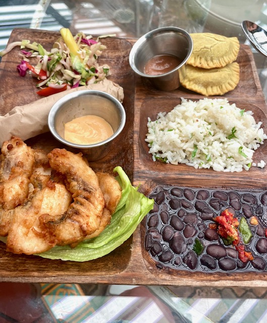 The “Dos” section featured lightly battered (and not greasy) sea bream on a lettuce leaf next to a small dish of chipotle aioli. Two flour and two corn tortillas were rolled into brown paper. A small side of delicious mango slaw, along with rice and black beans were ready to be scooped onto a lettuce leaf or tortilla to customize our own fish tacos.