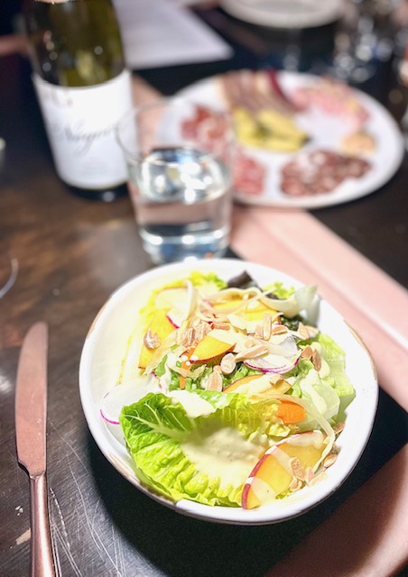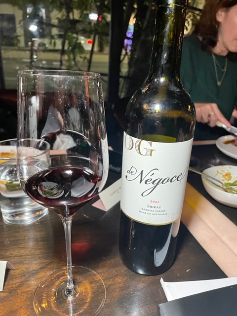 Turning back to the dinner, when Gwen’s Market salad arrived at the table, I enjoyed the summer sliced stone fruit, vegetables and a mild almond vinaigrette with two wines, a de Négoce 2022 Riesling from Clare Valley, South Australia and a 2021 Santa Ynez Rosé of Grenache. The first was a bone-dry white wine with intense lime, spice and grapefruit notes and a long floral finish. The original wine price is $25, but on the de Négoce website it sells for $13.