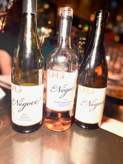 On a table were various bottles with de Négoce labels. Each label had the varietal, year made, region and state listed.