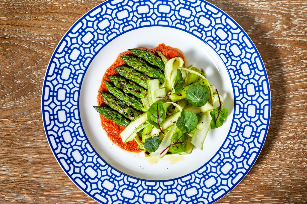 Asparagus spears perfectly cooked and placed on top of a Spanish tomato based Romesco sauce is another popular side dish. Curls of shaved raw asparagus, chopped Marcona almonds and hazelnuts topped this dish.
