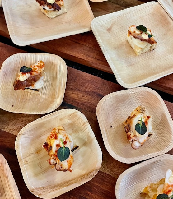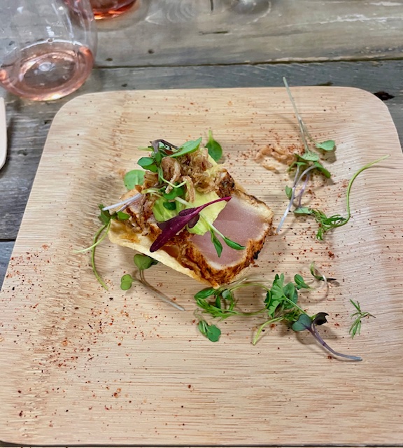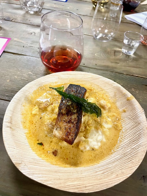 The hosts have two wonderful restaurants – Pez Cantina and Pez Coastal Kitchen. Chef Bret Thompson of PEZ CANTINA made a tasty Albacore Tuna Tostada that dazzled in flavor with chipotle aioli and Baja ponzu. He also made a crispy Pacific Sea Bass that was served with Meyer Lemon risotto and a seafood Bolognese sauce.