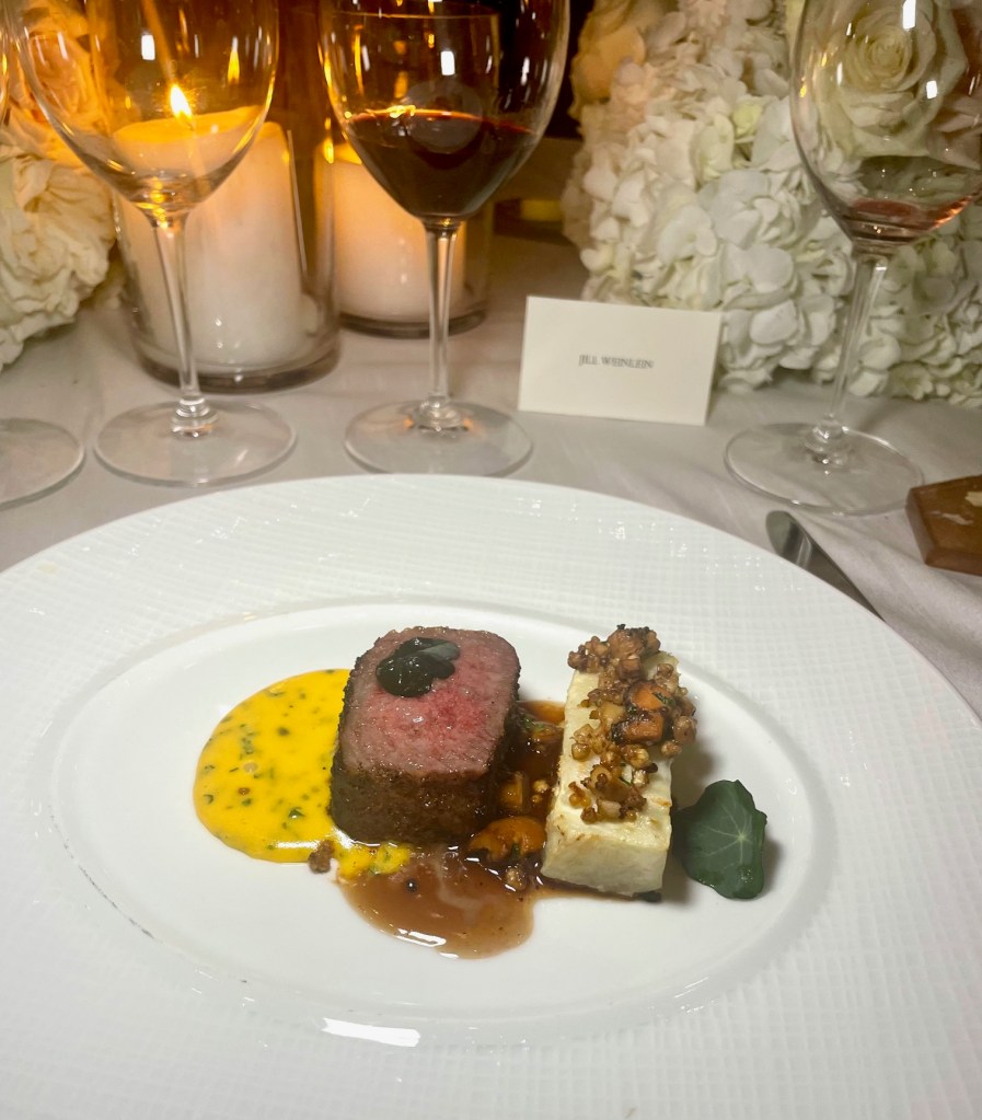 The evening started with passed appetizers that included Wolfgang Puck’s spicy Big Eye Tuna cones. Guests sipped the pale yellow 2021 La Clarte’ de Haut-Brion offering a delicate nose of white flowers and lemon. It’s made with grapes grown on the Haut-Brion terrior from two prestigious estates: Chateau Haut-Brion and Chateau La Mission Haut Brion.