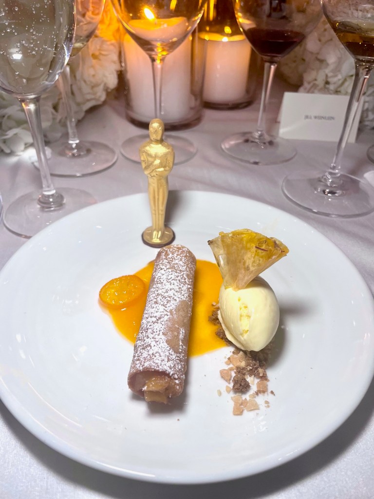 Guests enjoyed Pastry Chef Della Gossett’s Pineapple Strudel with a marzipan gelato and candied almonds. The star of the plate was a golden chocolate Oscar statue.