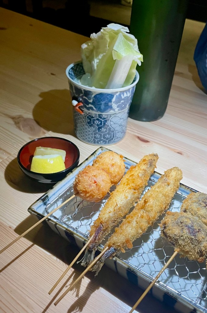 It’s best to start with an order of raw cabbage, daikon radish and carrot sticks to cleanse your palate after each fried skewer or stick. Another appealing appetizer is the potato salad with smoked eel.