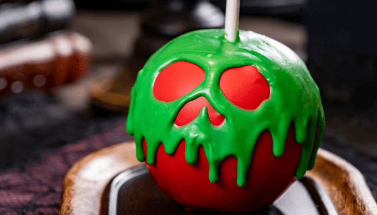 Candy Corn Minnie Apple – Green Granny Smith apple dipped in caramel, vanilla chocolate, orange-colored chocolate and yellow-colored chocolate, and adorned with a yellow chocolate bow and marshmallow ears