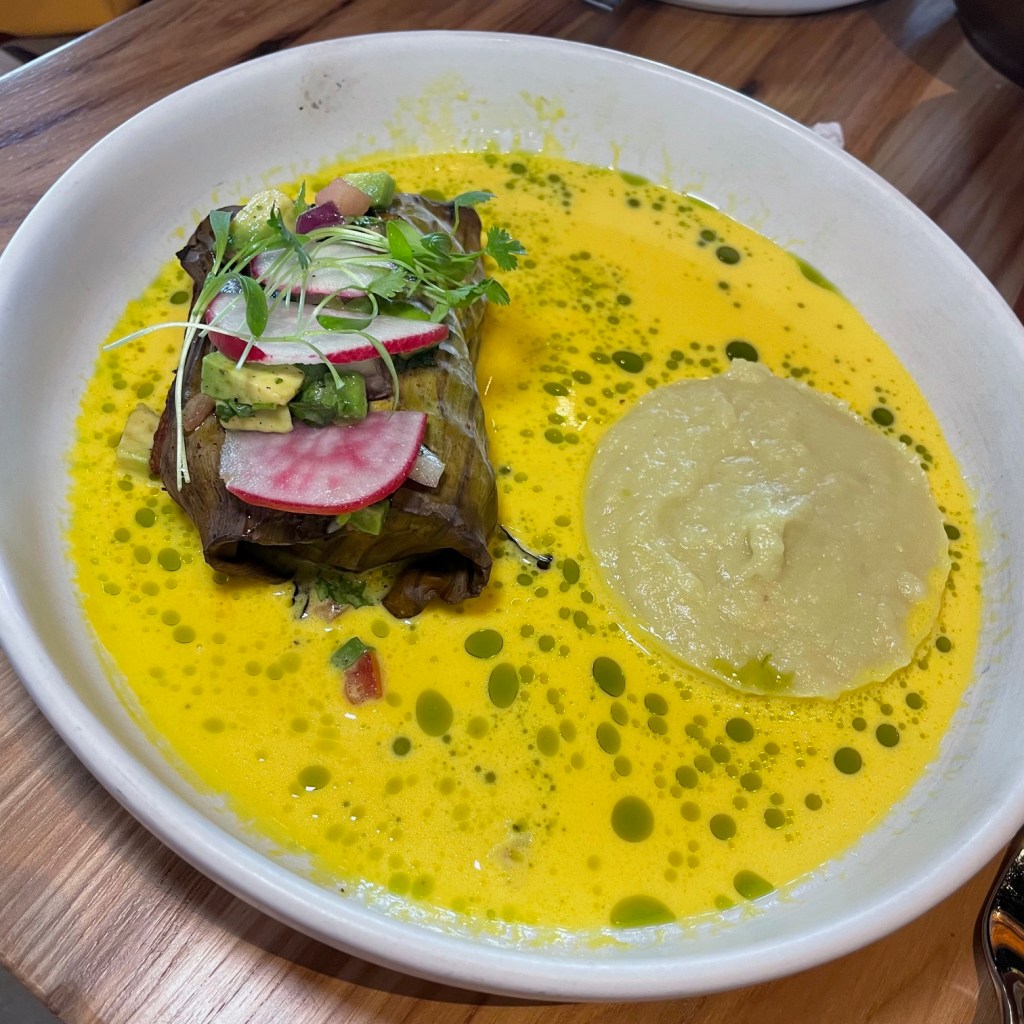 One of Chef Gaytán’s signature dishes is the catch of the day, Yucatan Fish wrapped in a banana leaf. This tender and flavorful entree dazzles in an achiote and orange marinade. It’s served with sweet potato pureé and a creamy habanero sauce. On top is a tomato and avocado salad.