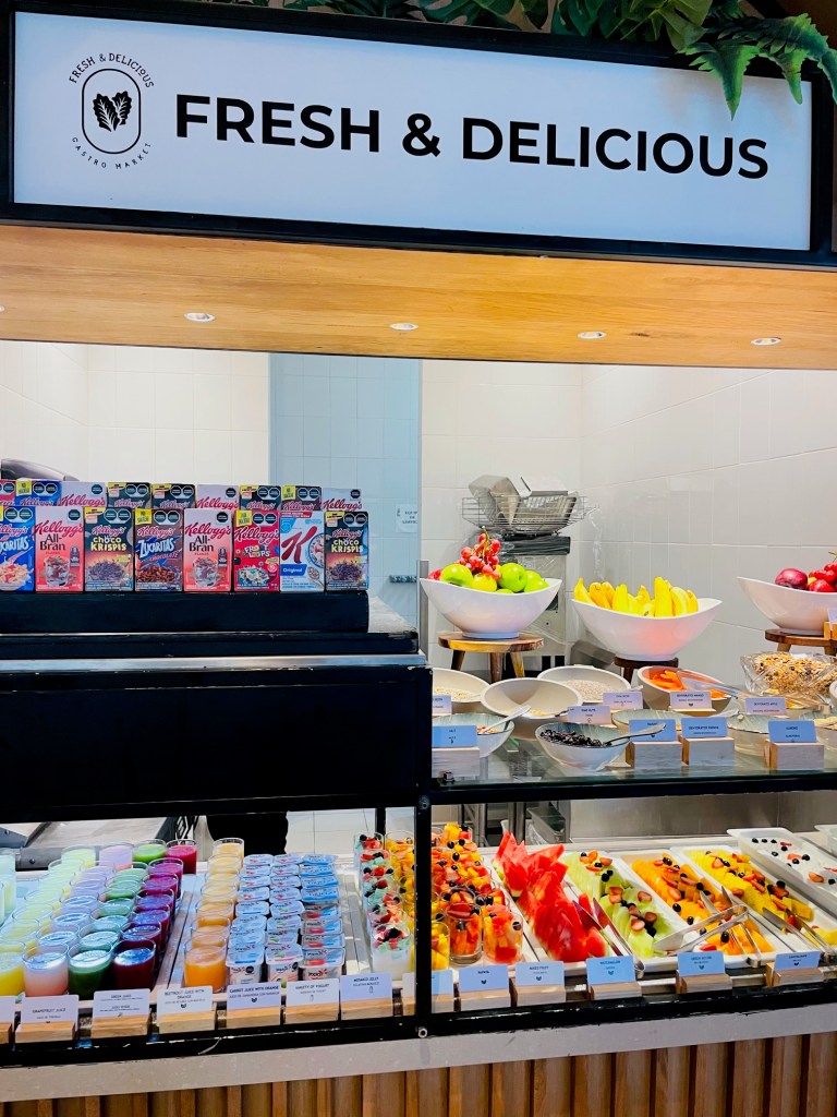 In the morning the different food stations offer a colorful array of grab and take back to your table items. Server pout coffee, tea, mimosas and juice at the table, while guests go up to the cook-to-order stations. The Sip counter pours any beverage your desire, while World Kitchen flips custom omelets in the morning and around the globe dishes ranging from kebabs to baos during lunch.