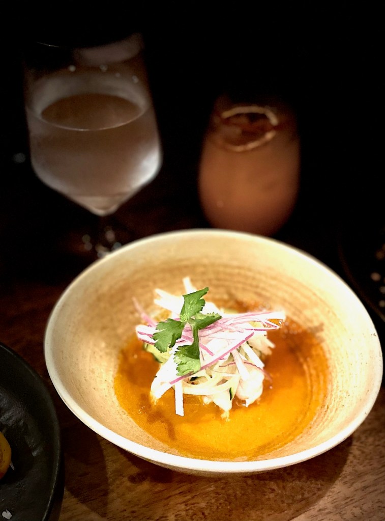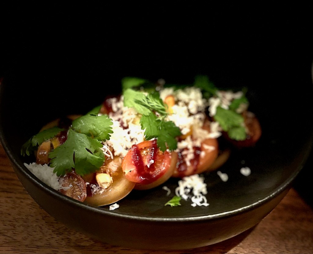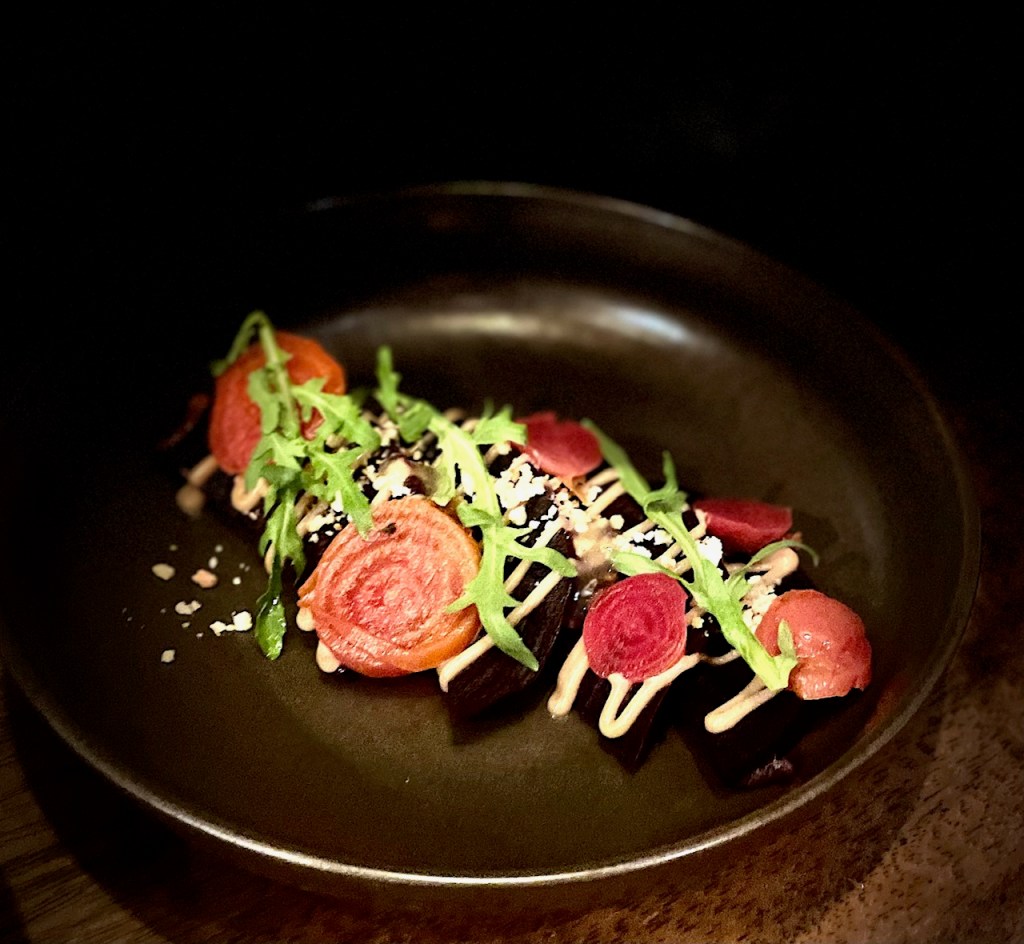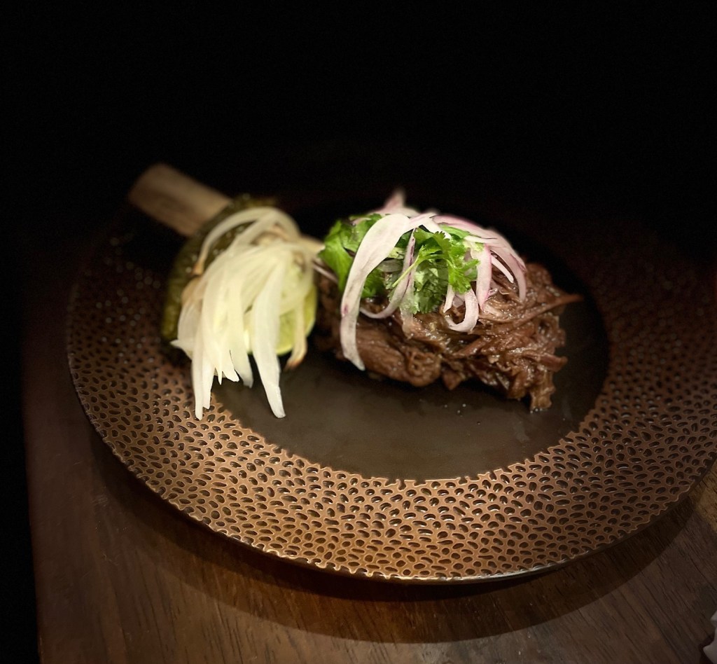 Handmade artisanal tortillas are shells for short rib tacos, slow cooked barbacoa beef taco dazzling with Mexican chili oil and an avocado puree. Also the tender marinated pork shank, ta vibrant tomato salad and beet salad. The guacamole here is enhanced with cubes of short rib chicharrones.