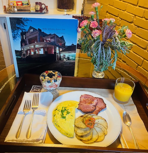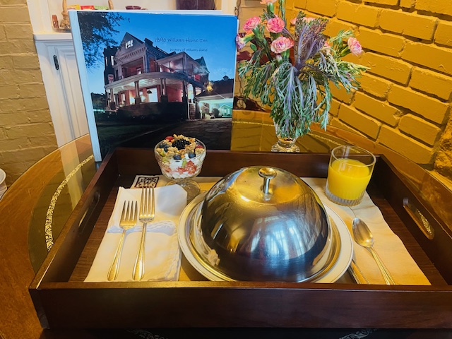 3. Delicious Breakfast: One of the highlights of my stay was the gourmet breakfast Cody and Joe made for me. Every morning a carafe of hot coffee and milk were delivered on a tray outside my guest room door by 7 a.m. Later they brought a hot breakfast tray into my small breakfast room. This area of the suite also had a refrigerator and microwave, plus a table for two to enjoy breakfast in the morning.