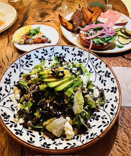 The menu right now offers an array of starters, such as crudités with hummus and ranch dips, roasted asparagus, and four different types of salads. The Farmhouse Market Salad is a cornucopia of veggies, nuts, herbs and Green Goddess dressing. We ordered the Chopped Grilled Vegetable Salad that was a dazzling array of balsamic grilled onions, grilled corn, feta cheese, avocado, chopped lettuce in a light red wine vinaigrette. There is also a Roasted Beet Salad and an Asian Chicken Salad that is enhanced with a citrusy kumquats and sesame vinaigrette.