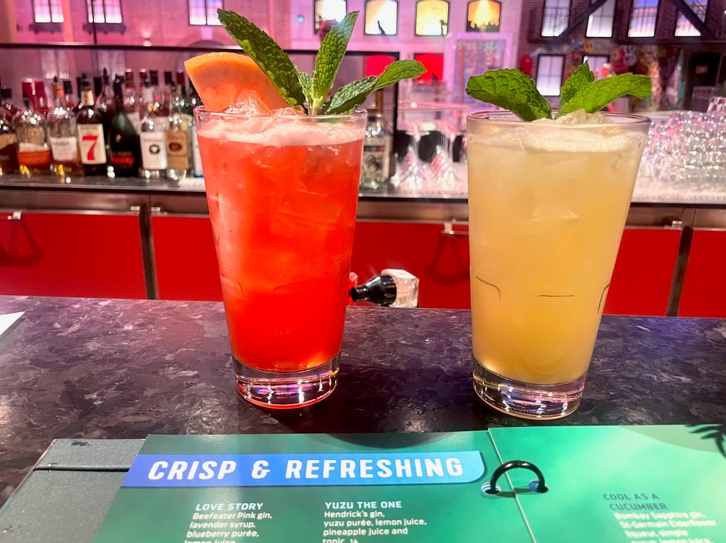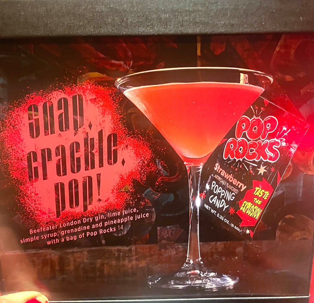 Over at the Dueling Pianos lounge, bartenders make a bright red colored ‘snap, crackle, pop! cocktail’ The Beefeater London Dry gin base is enhanced with lime juice, simple syrup, grenadine and pineapple juice. It’s garnished with a bag of Pop Rock candy for a popping beverage experience.